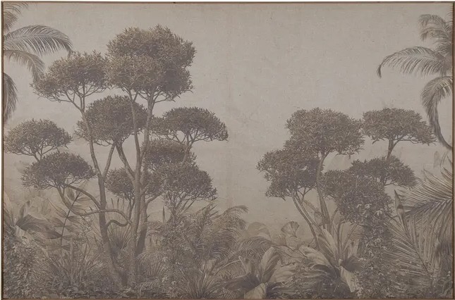 Sumerja su estancia en la serenidad de una jungla antigua con esta pieza de gran valor estético. Este cuadro presenta una detallada ilustración de estilo naturalista, donde la densidad de la flora tropical —palmeras, helechos y árboles de copa frondosa— se convierte en la protagonista absoluta. Su acabado monocromático evoca la elegancia de las expediciones botánicas del siglo XIX.