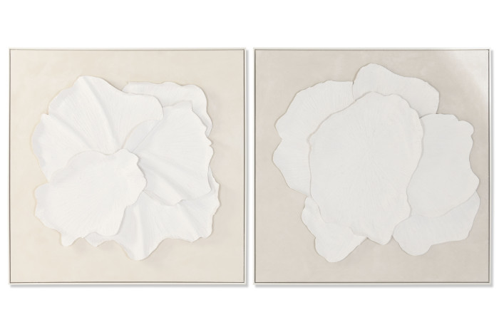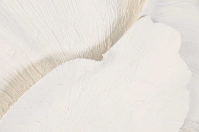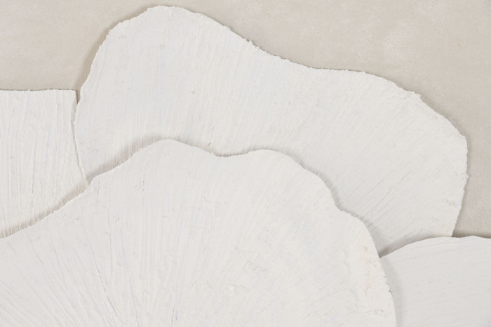 Esta obra de arte contemporáneo presenta una composición minimalista de formas orgánicas superpuestas que evocan pétalos de flores en tonos blancos sobre un fondo neutro. La pieza izquierda destaca por su textura pronunciada y variación en las capas, mientras que la derecha ofrece una estética más uniforme y suave. Ambas crean una sensación de profundidad y movimiento a través del juego de luces y sombras, sin recurrir al color. Ideal para espacios modernos que buscan transmitir serenidad, elegancia y sofisticación a través del arte abstracto.