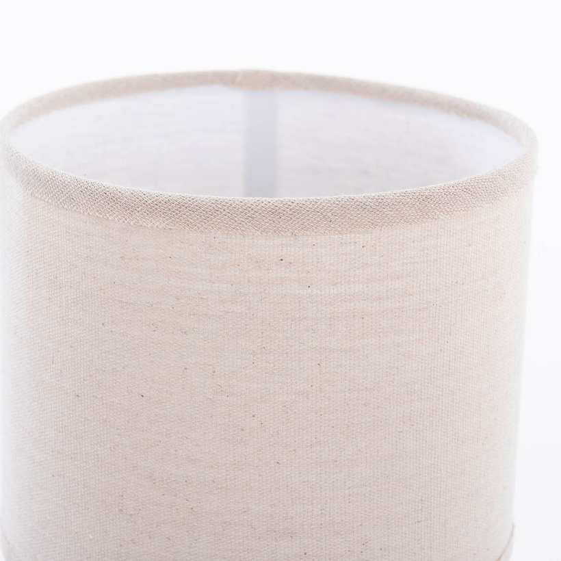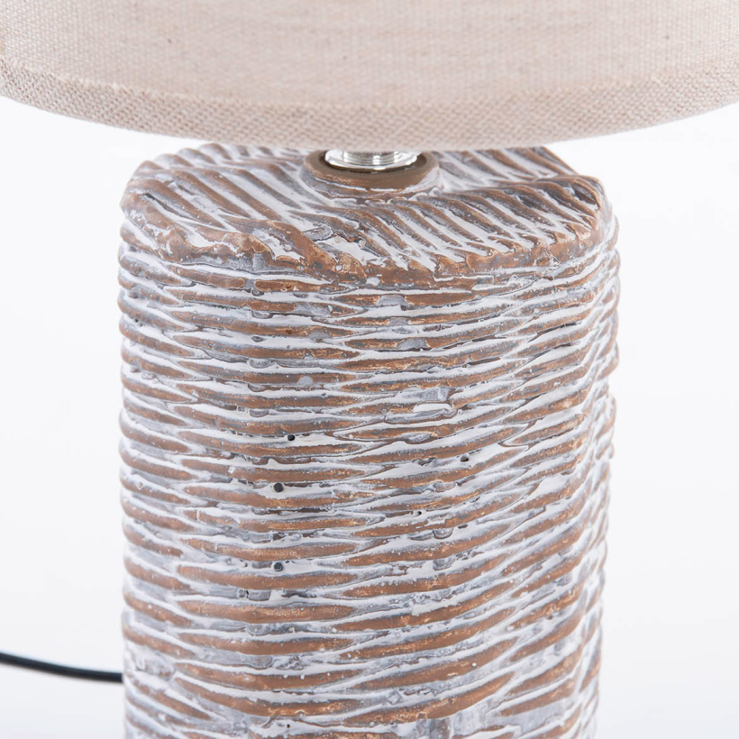 Lámpara tamaño pequeño base cerámica imitando a ratán pintado en blanco decapado. Color natural y blanco. Pantalla color lino natural.